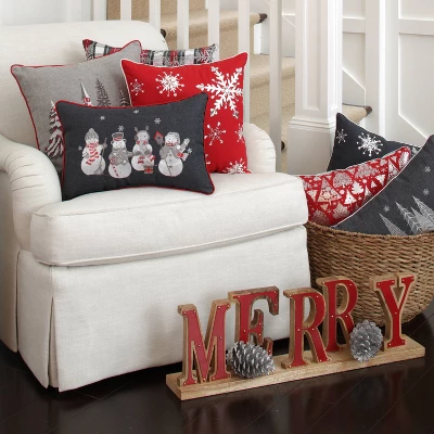 This decorative pillow will add the perfect blend of holiday charm to your festive decor. The dark gray ground gives a subtle, yet striking variation from the red, gray and white embroidery that is highlighted with a metallic silver shimmer. Additional features of this lumbar pillow include a red welt cord and recycled polyester fiber fill with a sewn seam closure.