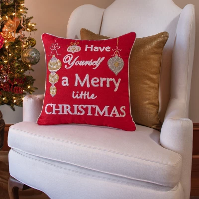 It’s all glam and merry as ever! A striking display of shimmering golds, metallic silvers, and soft shades of white, this Christmas throw pillow cover (pillow insert sold separately) is all dressed up for that holiday party. Appliqued and embroidered, the festive sentiment and ornate ornaments make a dynamic duo atop the Christmas red ground creating captivating dimension and alluring interest. Additional features of this throw pillow cover include a coordinating metallic silver welt cord for a clean finish and a zipper closure. The 18″ x 18″ throw pillow insert is sold separately. Simply zipper this insert into the pillow cover for a perfectly shaped pillow.