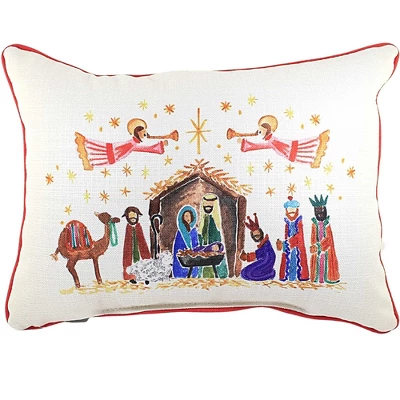 Decorate Your Living Room With This Christmas Themed Pillow. This Is A Cream Square Pillow Nativity Scene On It. This Scene Shows Jesus, His Parents, The Wise Men, A Shepherd, Angles, And Stars.. New.. Measurements 16 In H X 16 In W X 5.5 In D. Made Of Polyester. No Assembly Required. Indoor Use Only. Made In Usa. PRODUCT CARE: Washing Machine On A Delicate Cycle (Cold Water), Fluff, And Air Dry Flat.